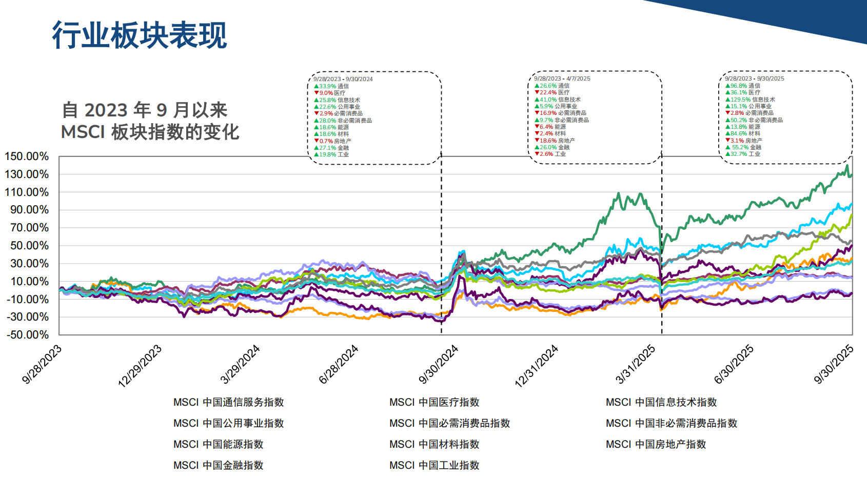 在整體經(jīng)濟環(huán)境下,通信板塊表現(xiàn)亮眼。MSCI中國通信服務指數(shù)自2023年9月以來累計上漲96.8%,遠超大盤。該板塊在2025年前三季度的表現(xiàn)尤為強勁,是推動整體指數(shù)上揚的核心動力之一。