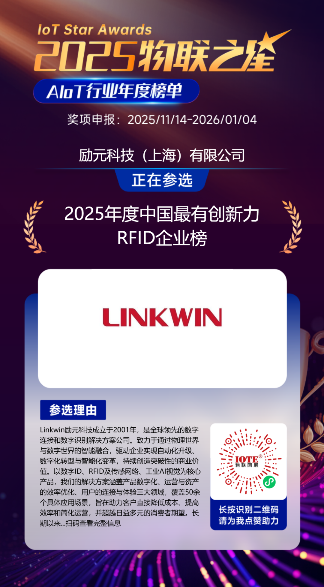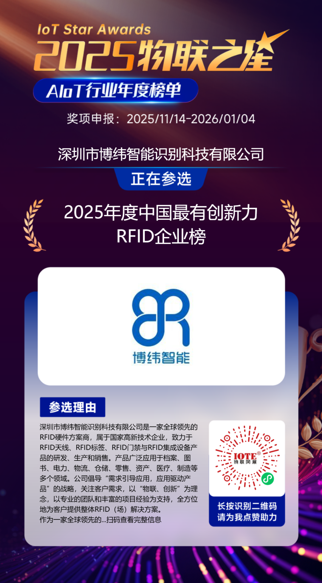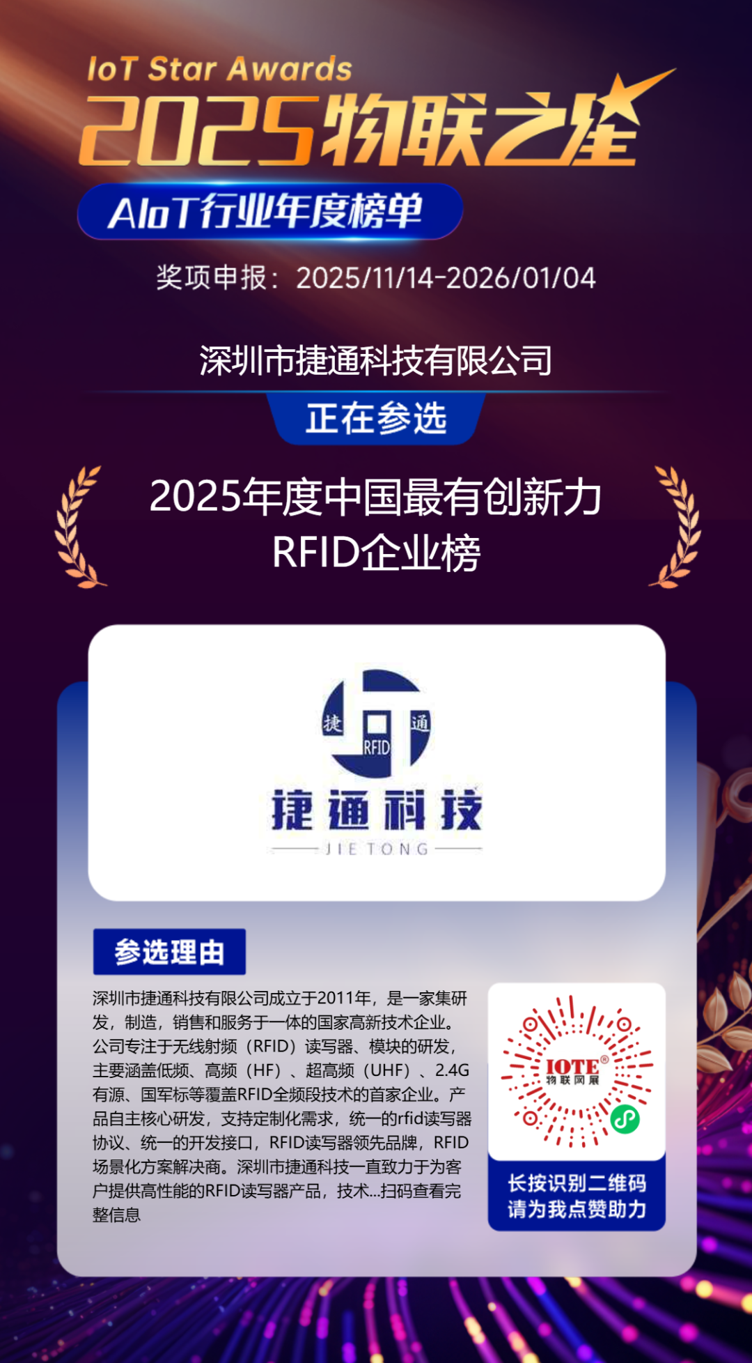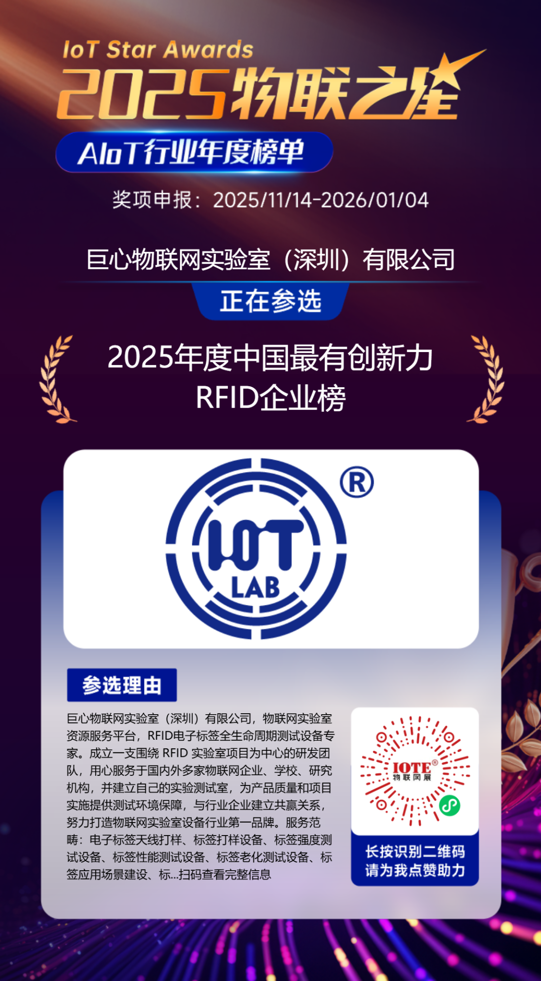 在此背景下,“物聯(lián)之星”2025年度中國最有創(chuàng)新力RFID企業(yè)榜申報(bào)通道現(xiàn)現(xiàn)全面開放,登錄官方網(wǎng)站(https://vote.iotworld.com.cn)即可報(bào)名,報(bào)名截止至2026年1月4日。