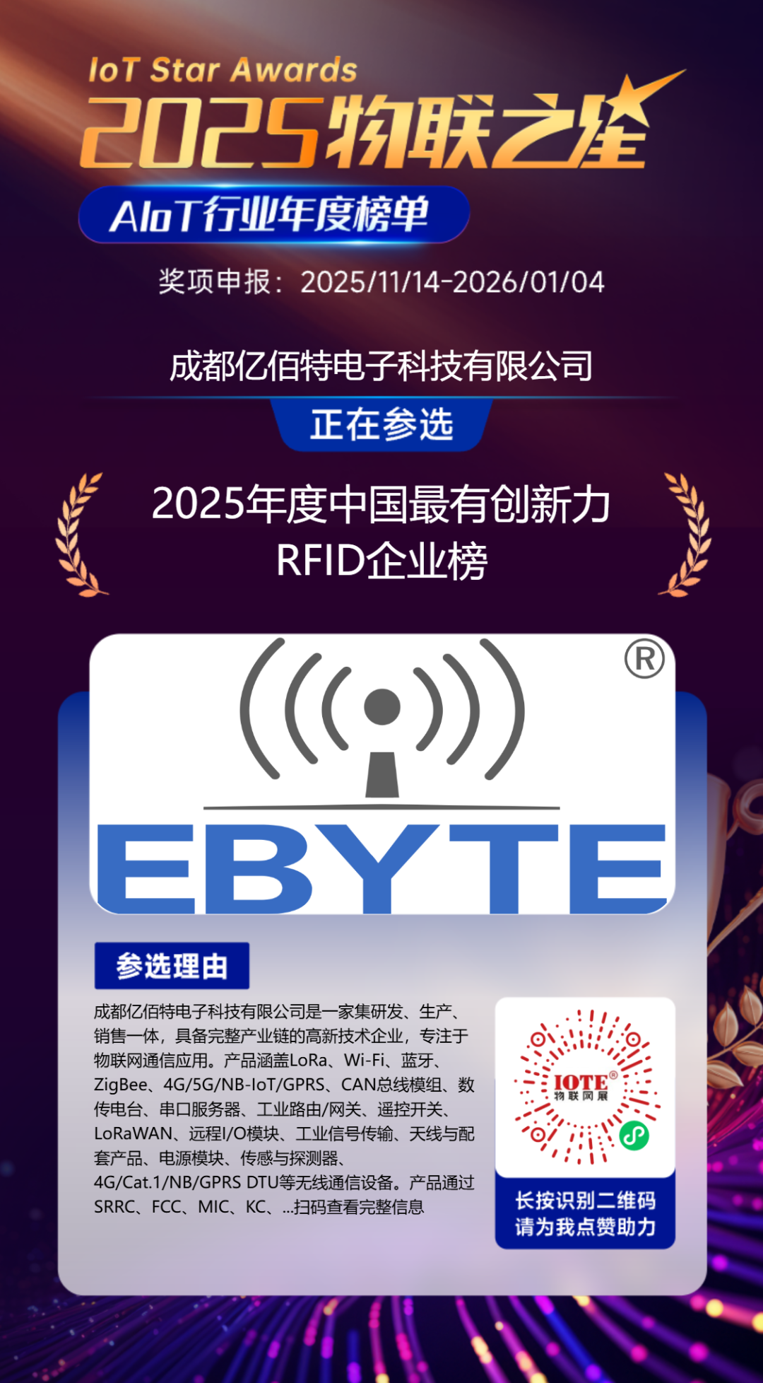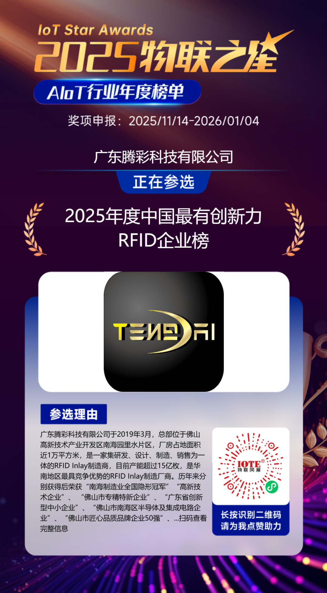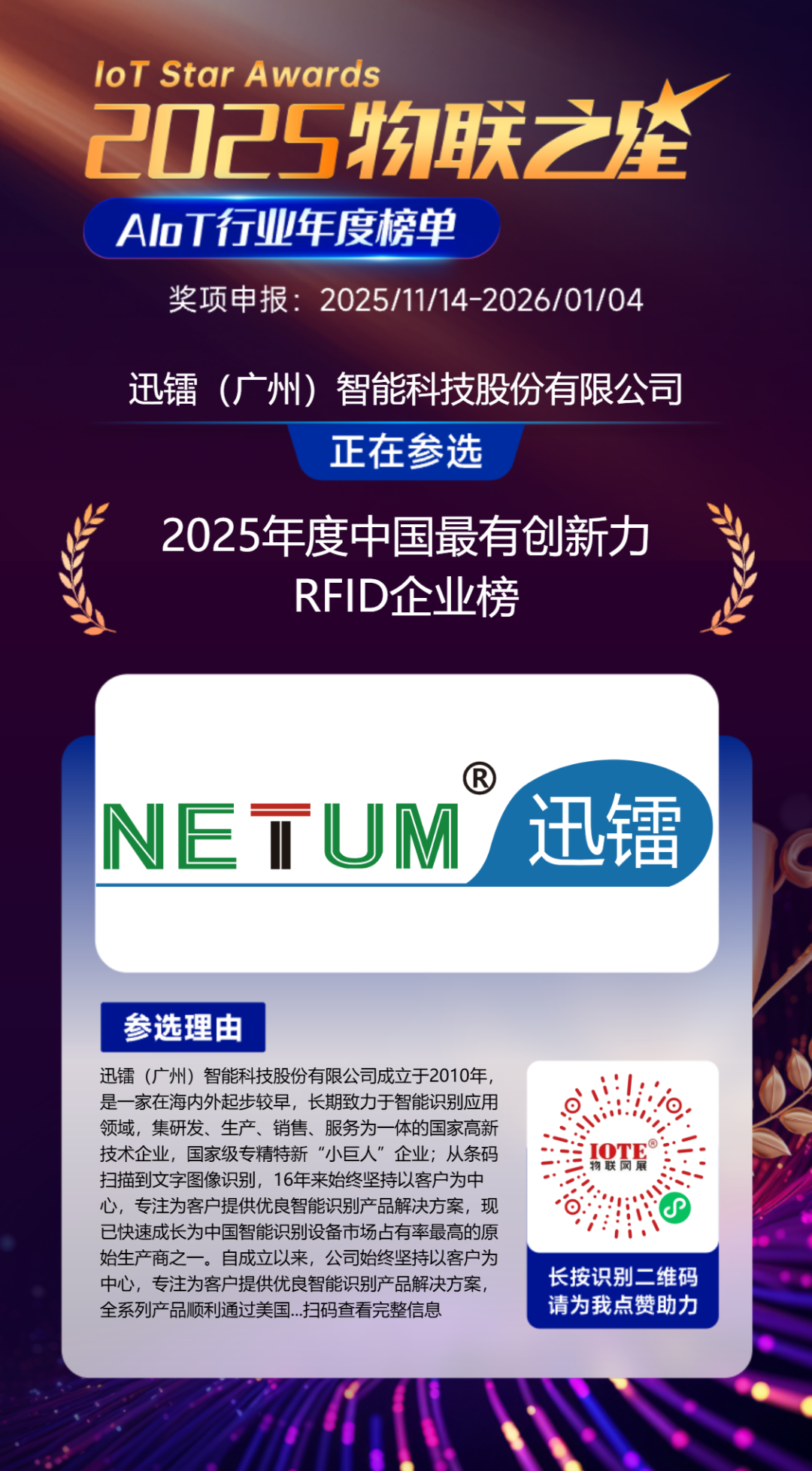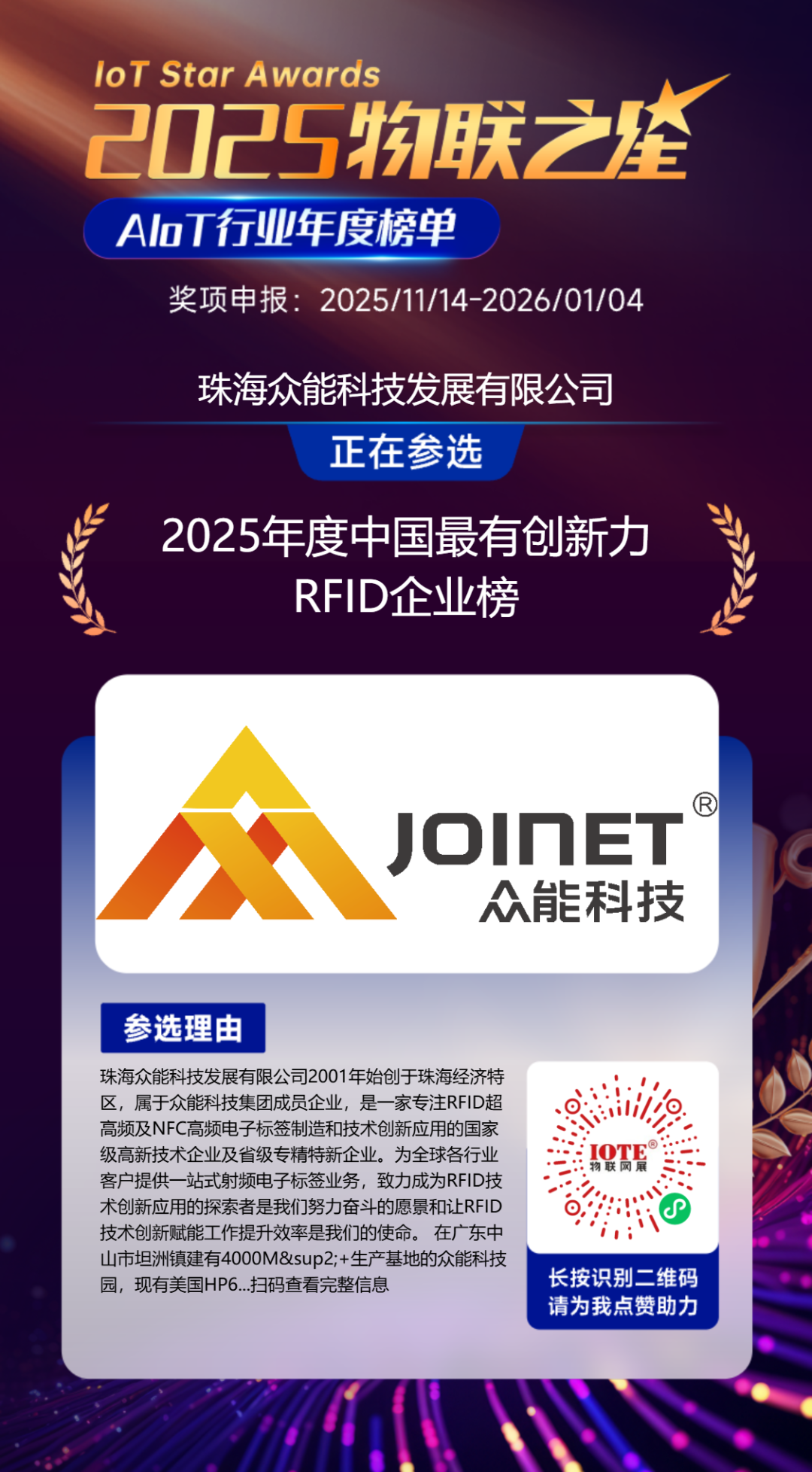 在此背景下,“物聯(lián)之星”2025年度中國最有創(chuàng)新力RFID企業(yè)榜申報(bào)通道現(xiàn)現(xiàn)全面開放,登錄官方網(wǎng)站(https://vote.iotworld.com.cn)即可報(bào)名,報(bào)名截止至2026年1月4日。